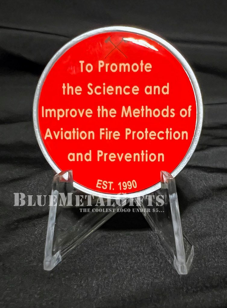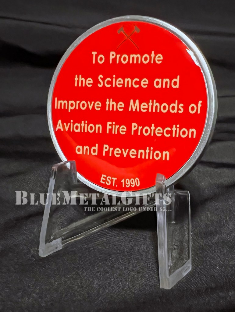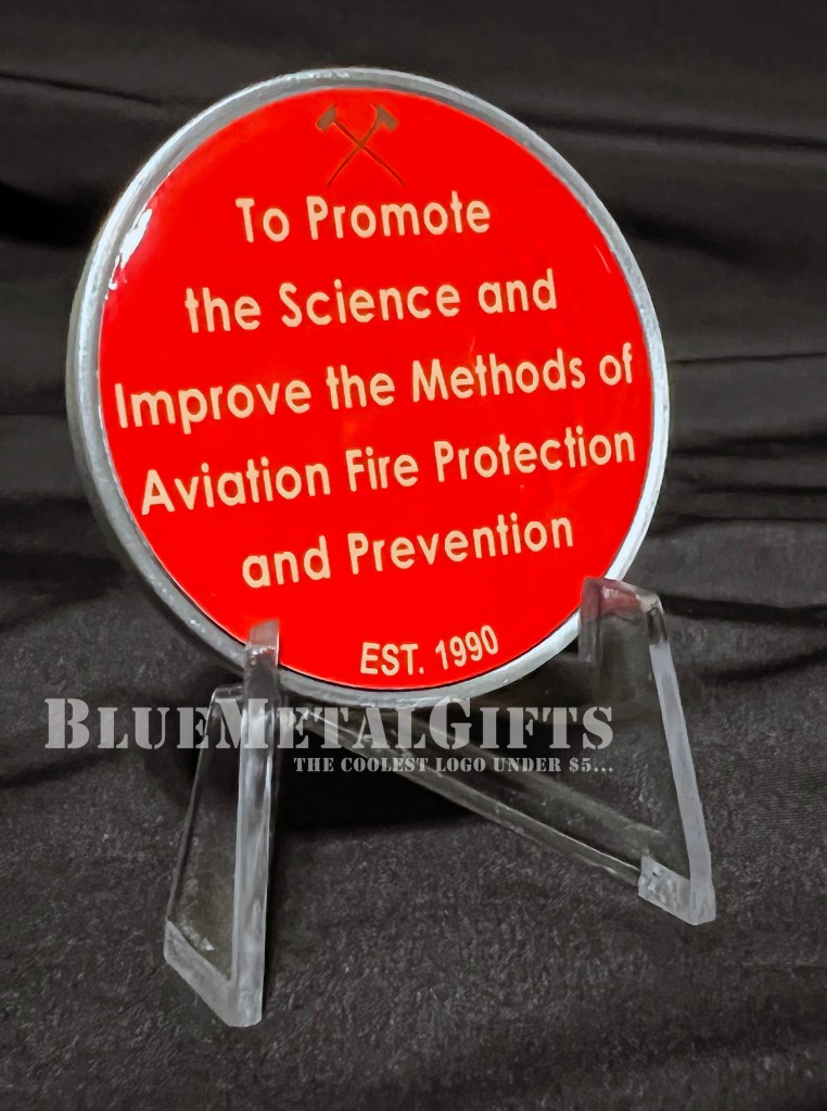 The back of the coin has 2 axes crossing each other at the top. The message says: To Promote the Science and Improve the Methods of Aviation Fire Protection and Prevention