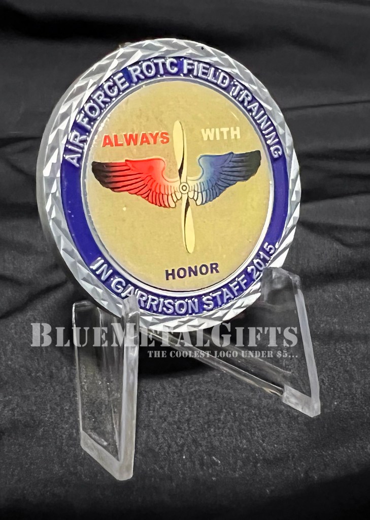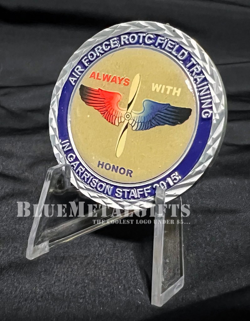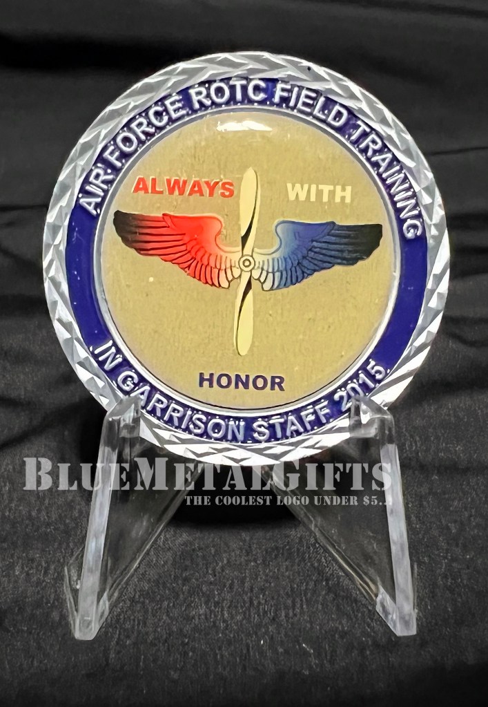 The back of the coin has these words written around it: AIR FORCE ROTC FIELD TRAINING IN GARRISON STAFF 2015 That text has a blue enamel color. The center of the coin is offset printed with a winged design which have a red to white to blue gradient. A propellor connects both wings. The text above and below the wings says: ALWAYS WITH HONOR