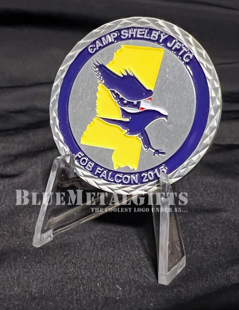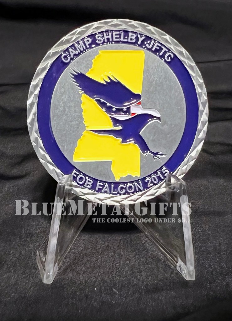 This unique coin is made from a lighter, alloy metal. The front has these words written around it: CAMP SHELBY JFTC FOB FALCON 2015 Centered is an eagle with blue enamel. Inside the eagle is a partial display of the US flag. In yellow enamel is the state of Mississippi.