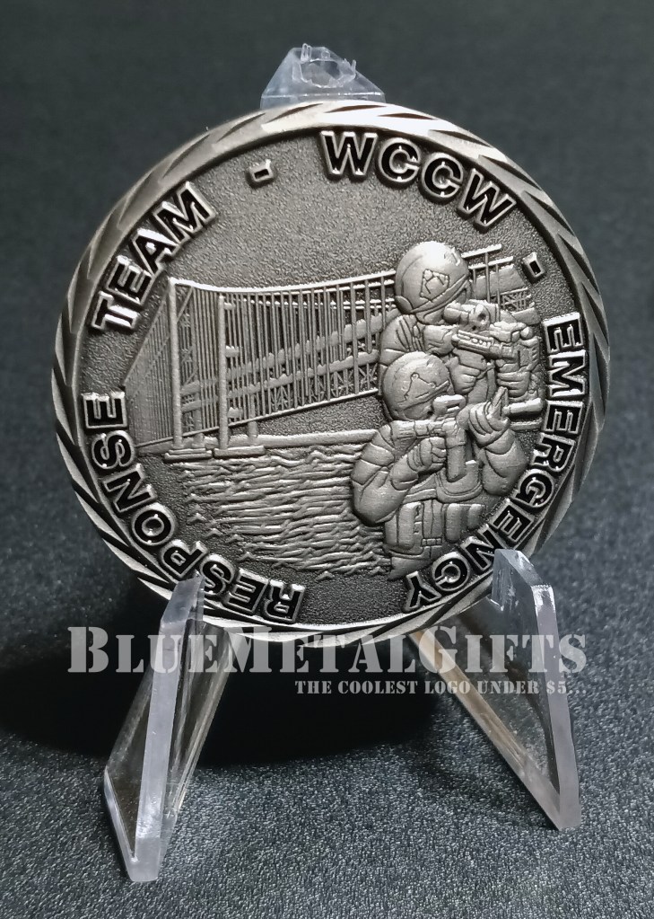 This highly detailed coin has 2 SWAT members aiming down the sights of their rifles. Behind them is the Tacoma Narrows Bridge located in Pierce County, Washington. Under the bridge is the water and beyond that is land. The text around the outside of the coin says: EMERGENCY RESPONSE TEAM – WCCW –