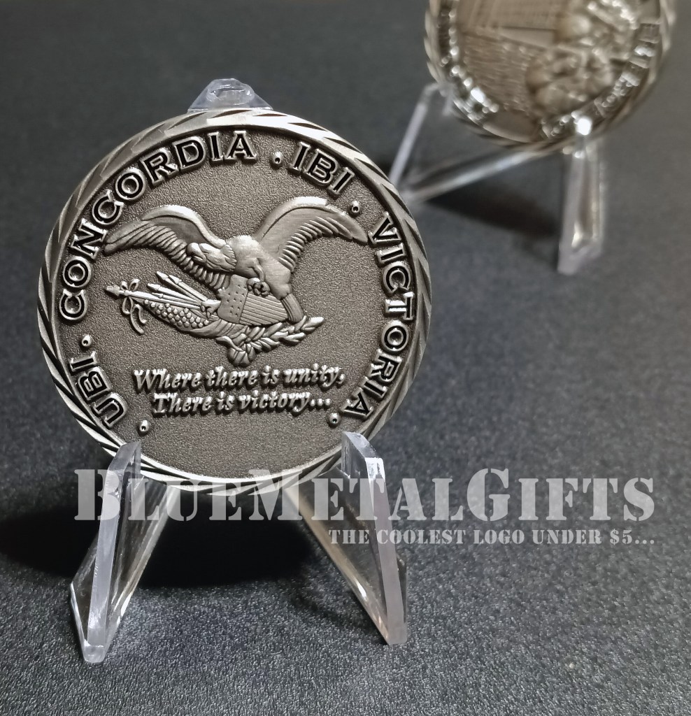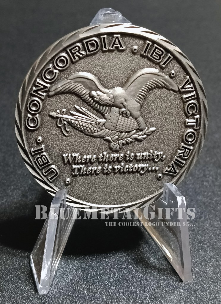 The back of the coin says: . UBI . CONCORDIA . IBI . VICTORIA. We’re unsure of the translation, but feel free to reach out to us! There is a 3d eagle holding a set of arrows, the US flag, an olive branch, and a shield. Below the eagle, the text says: Where there is unity, There is victory…