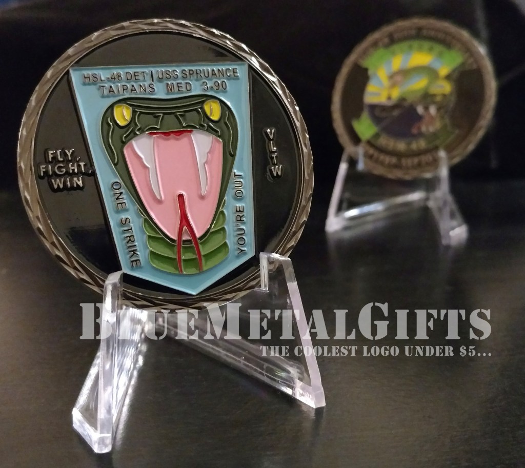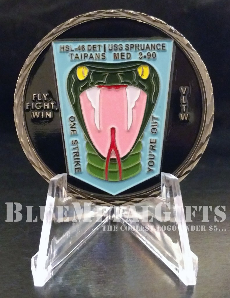 The dates on the front says, Sep 1989 – Sep 2019. The text on the back says, “HSL-48 DET | USS Spruance Taipans MED 3-90” Fly, Fight, Win, VLTW, One Strike You’re Out