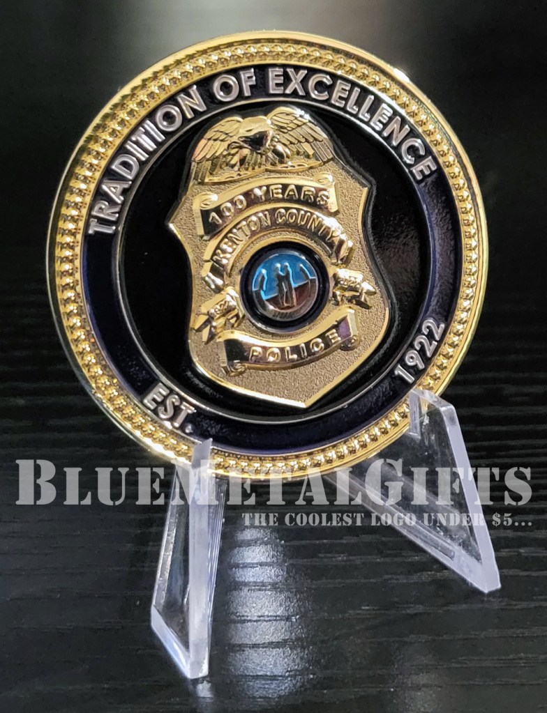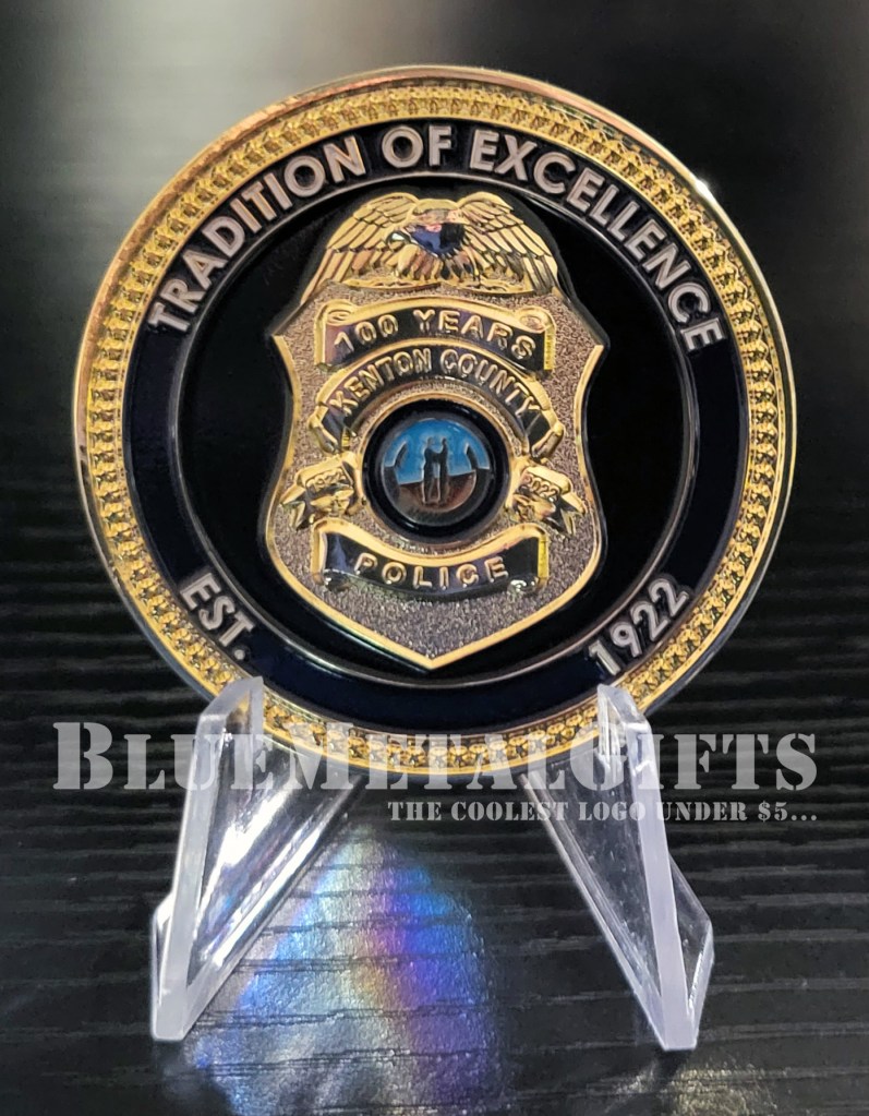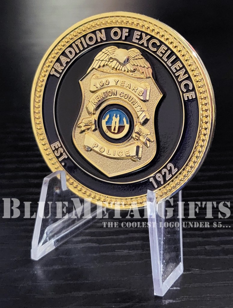 This shiny gold coin has the Kenton County Police badge proudly displayed on the front. Within the badge, the text states: 100 YEARS KENTON COUNTY POLICE A shiny gold eagle protects the top portion of this badge. The years inside the banner in the badge say: 1922 2022 A smaller version of the Kentucky flag sits in the very center of this police badge. Along the outside of the coin, the text reads in white enamel: TRADITION OF EXCELLENCE EST. 1922 A total of 100 stars adorn the farthest outside edge of this coin. The enamel colors of blue and black finish the backgrounds.