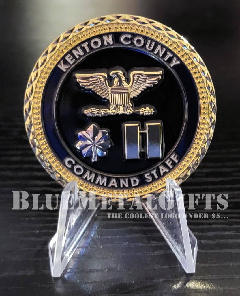 The back of this beautifully detailed coin also has 100 stars along the outside edge. Located just inside of the stars, the text reads: KENTON COUNTY COMMAND STAFF A highly detailed bald eagle stands with its wings spread. Its talons hold 13 golden arrows. The lower left is a shiny silver leaf rank. Opposite to it is are 2 vertical, shiny gold bars – also a rank. This side has a diamond edge cut.