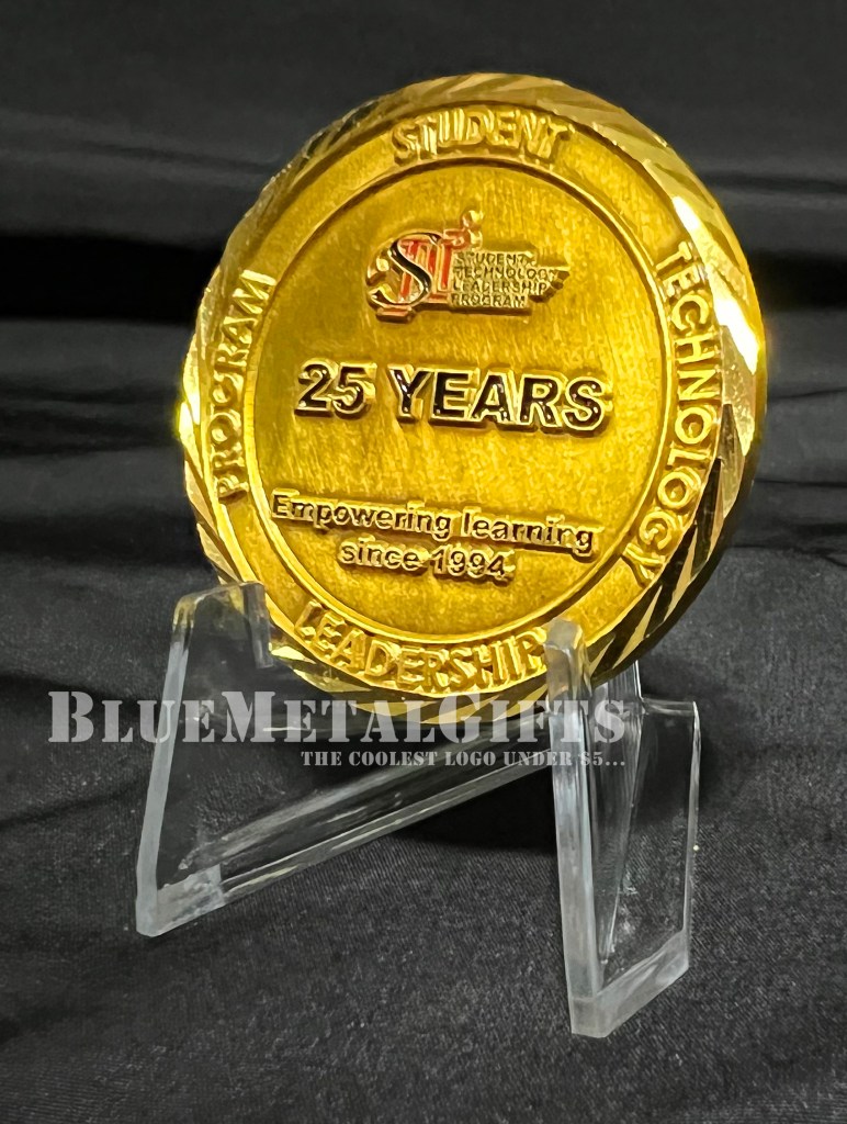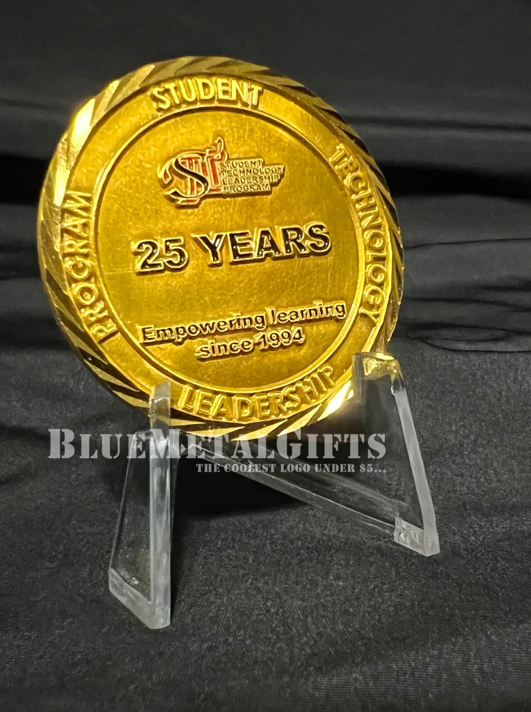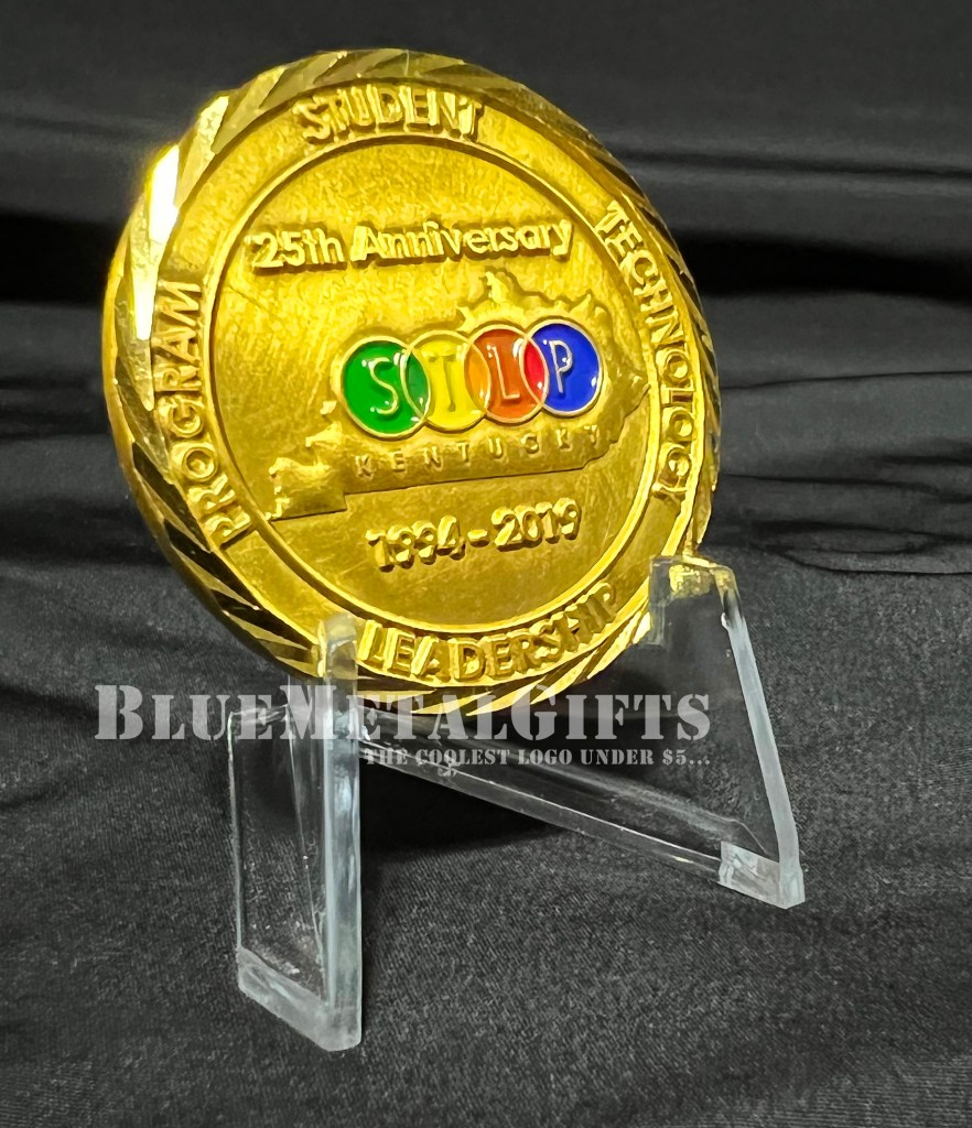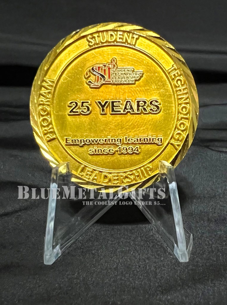 This Student Technology Leadership Program (STLP) coin is from the state of Kentucky. It has the letters STLP in various enamel colors of green, gold, red, and blue encircling it. This coin celebrates the 25th anniversary of the program: 1994 – 2019